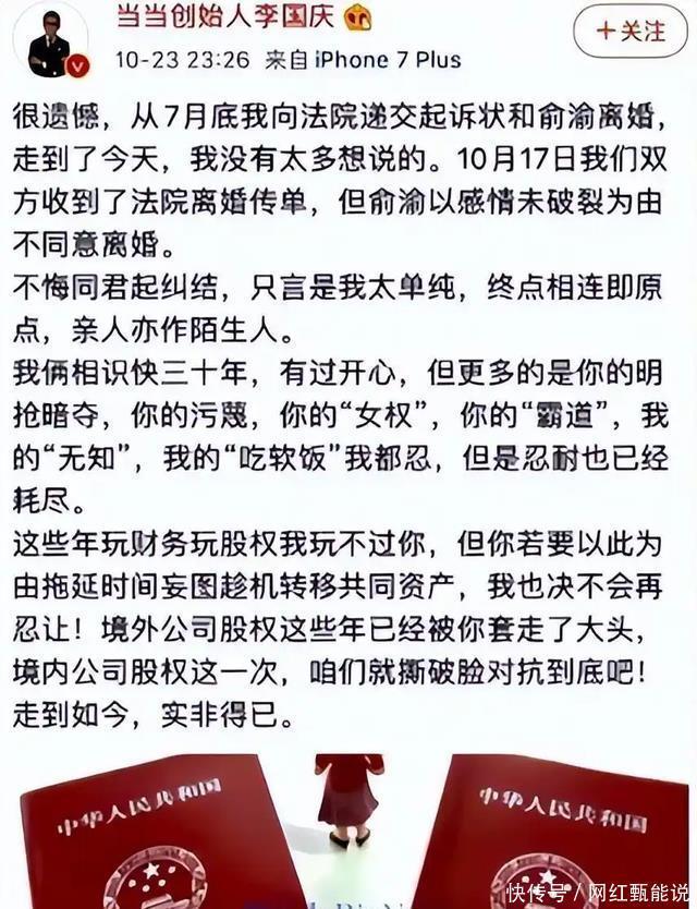 2019年10月,李国庆在微博上公开表示,自己已经向法院提交了离婚申请。 然而俞渝并没有同意这一诉求,她坚持认为两人之间仍然存在感情,并不符合法律认定的“感情破裂”条件。